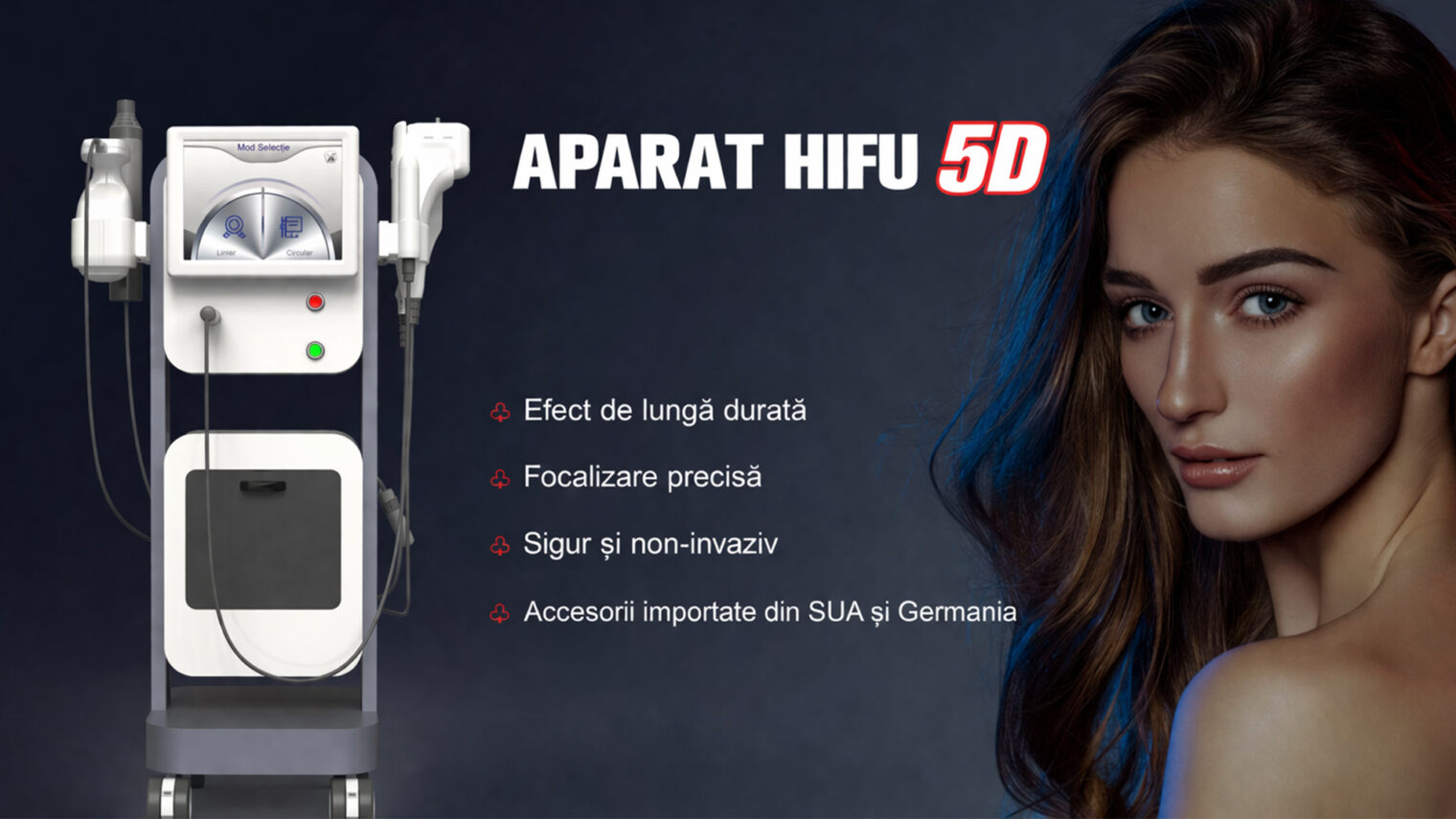 Sistemul profesional 5D HIFU oferă o soluție modernă, non-invazivă, pentru lifting facial și rejuvenare cutanată, fiind conceput pentru a reda fermitatea și conturul natural al feței. Tehnologia utilizează ultrasunete focalizate de mare intensitate, care acționează precis asupra diferitelor straturi ale pielii, stimulând regenerarea naturală a colagenului.